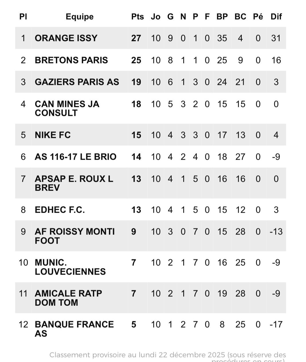 • Pour sa première saison en FFF Critérium R1 Élite, l’EDHEC FC est dans son rôle. Avec une 8e place après 10 journées et une différence de buts positive, l’équipe s’installe dans le milieu de tableau, exactement là où elle veut être cette saison : apprendre le niveau, se stabiliser et assurer le maintien sans frayeur. La base est solide, même si la régularité reste à construire.