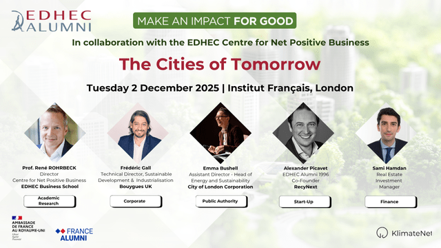 After the success of previous events on food security, biodiversity, and the role of AI in driving a greener future, the EDHEC Alumni UK Board’s “Make an Impact for Good” sustainability programme, held in partnership with the French Embassy in the UK and France Alumni, is delighted to collaborate with the EDHEC Centre for Net Positive Business to present another insightful conference on the inspiring theme of “The Cities of Tomorrow.”