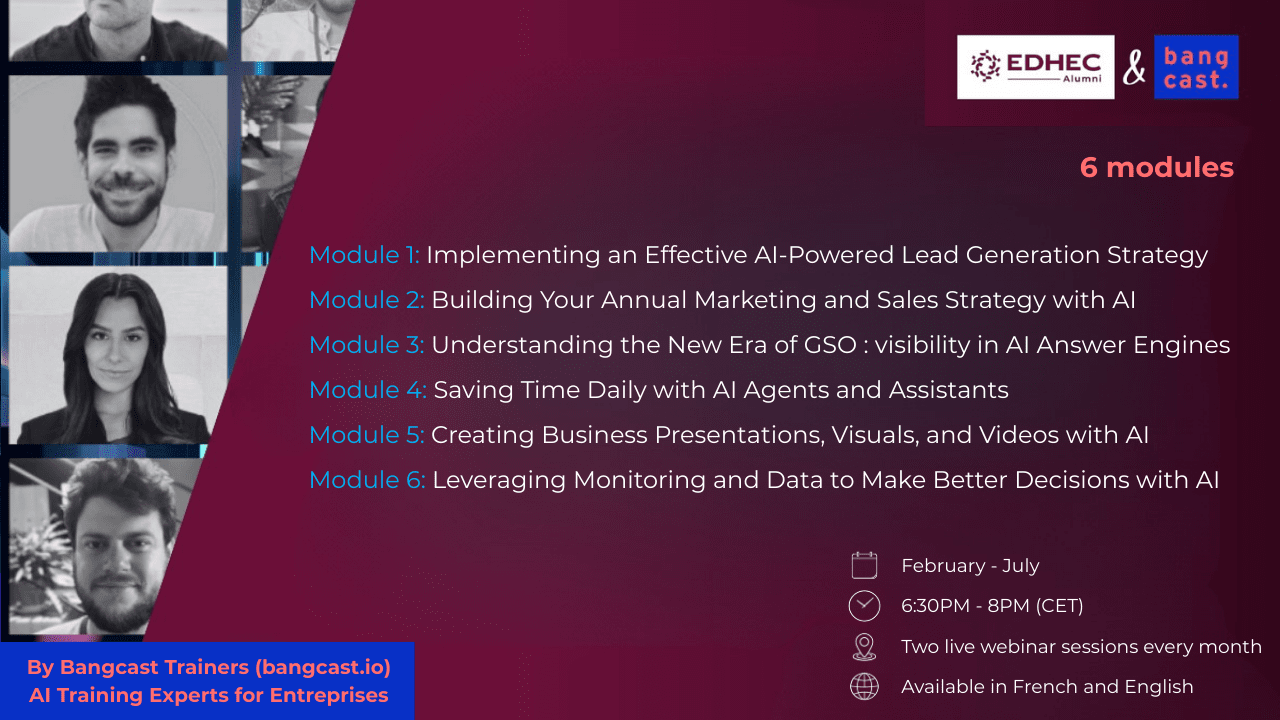 Chaque inscription inclut l’accès à la session live ainsi qu’une bibliothèque exclusive de prompts IA co-brandée EDHEC x Bangcast.