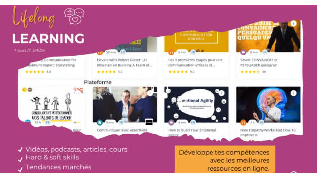 - Explore les nombreux formats disponibles pour te former en toute simplicité. Seulement quelques minutes de libre ? Tu as accès à une multitude de vidéos, podcasts, articles. Envie de prendre ton temps ? Découvre les meilleurs cours en ligne pour te former !