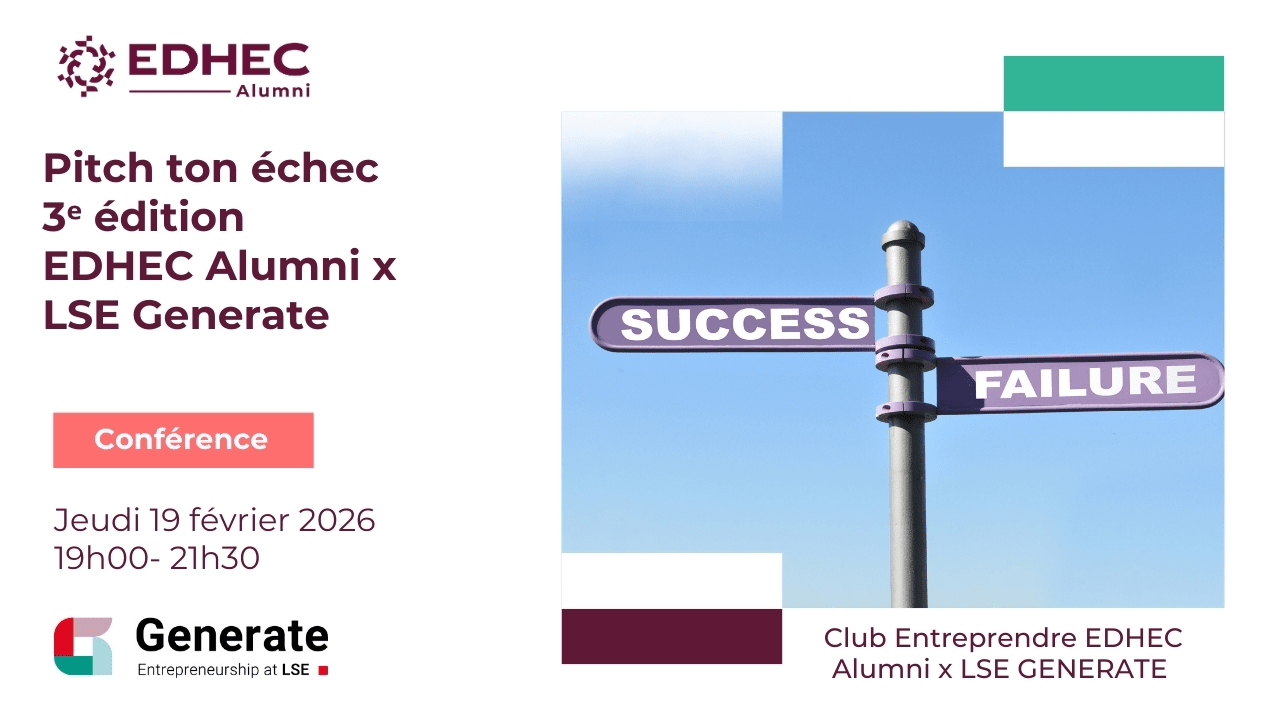 Pour cette édition spéciale, nous réunissons le meilleur de nos deux réseaux. 4 alumni issus d'EDHEC Alumni et de la LSE monteront sur scène pour pitcher leurs échecs. Pas de filtres, pas de langue de bois : ils partageront leurs erreurs de parcours et les enseignements stratégiques qu’ils en ont tirés.