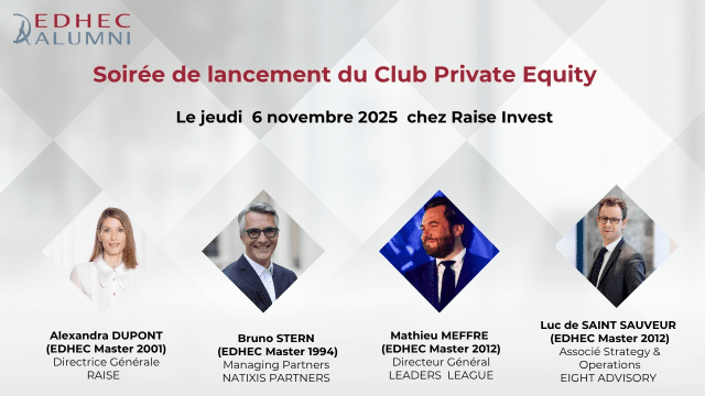 Le Private Equity réunit des acteurs essentiels à chaque étape de la vie des entreprises. Le 6 novembre 2025, EDHEC Alumni lancera son Club Private Equity chez RAISE, lors d’une soirée dédiée aux échanges et au partage d’expériences avec des figures majeures du secteur.