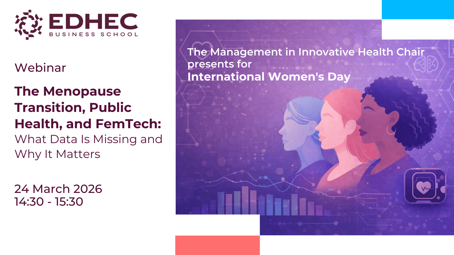 In honour of International Women’s Day, EDHEC's Management in Innovative Health Chair is hosting a webinar spotlighting a major blind spot in women’s health: the menopause transition, which affects millions of women, yet remains under‑recognised in population health indicators, under‑measured in routine health data, and under‑prioritised in research and investment. This data blind spot has real consequences, as it limits how public health stakeholders understand needs, how health systems plan services, and how digital solutions are designed, evaluated, and scaled.